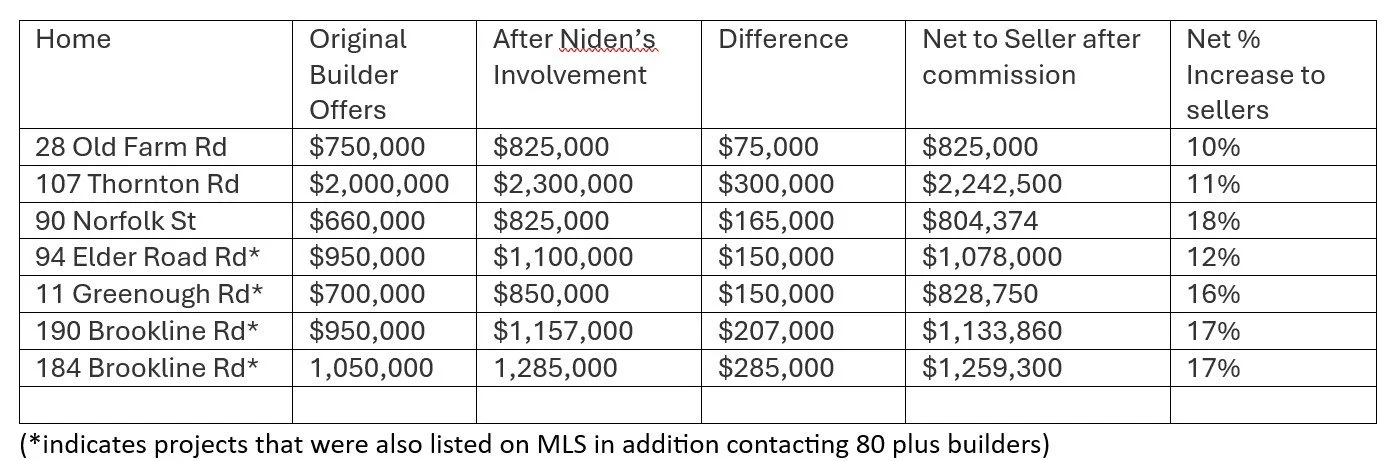 Welcome to our unique new program we are now offering to homeowners who have been contacted by a builder looking to purchase your home. Maybe your home fits a “tear down” profile, is an estate sale, or you are eager to downsize or relocate quickly and need a broker to work on your behalf without getting into a long, protracted sale process. We can help, directly handle the details, and make your home sale as profitable as possible, putting more money in your pocket. No other real estate agent implements these innovative teardown strategies. Commissions are 1/2 of conventional agents- Call Michael and find out why. 781-801-2151